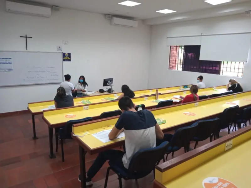 A la presentación del examen llegaron 600 estudiantes, quienes, uno a uno, debieron garantizar el cumplimiento de los protocolos de bioseguridad en la Universidad, que consistían en mantener la distancia físico, el uso adecuado del tapabocas y el lavado de manos.